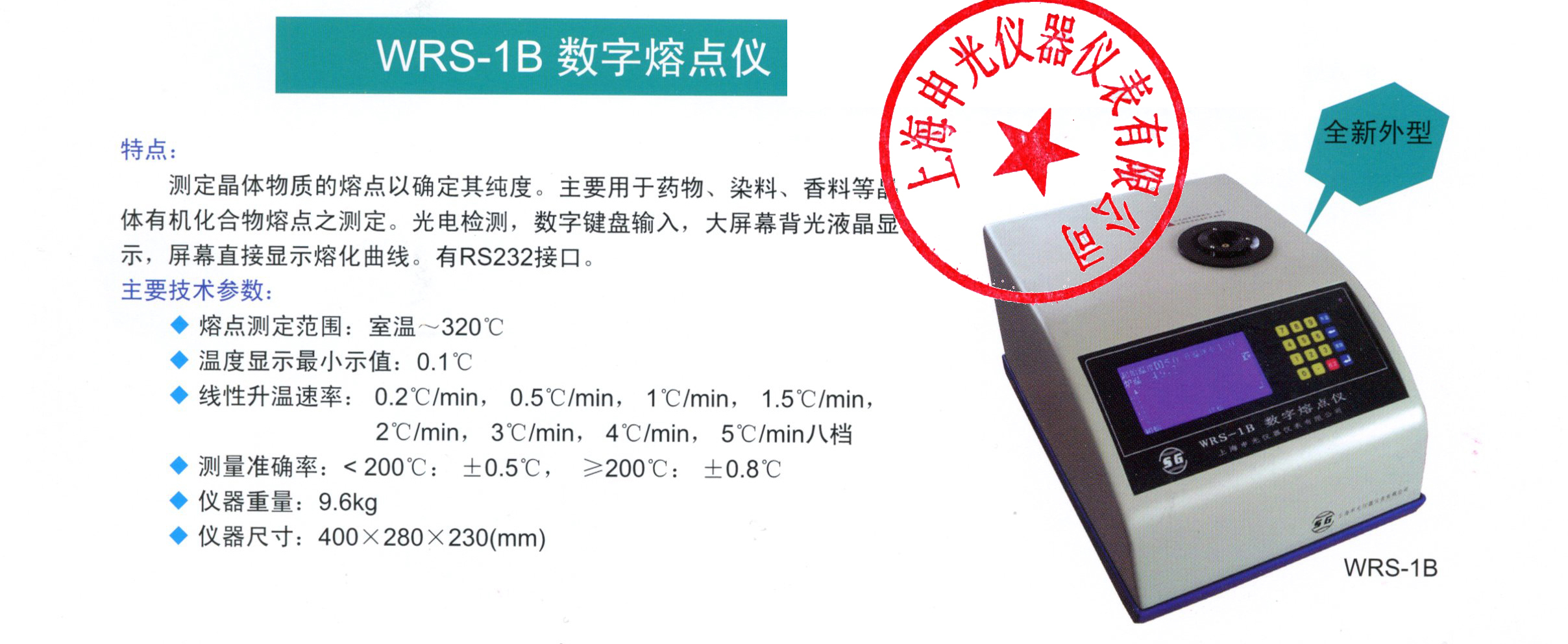 光电检测,数字键盘输入,数字显示,大屏幕背光液晶显示,配有RS232接口,可向PC机传送数据,屏幕直接显示融化曲线。