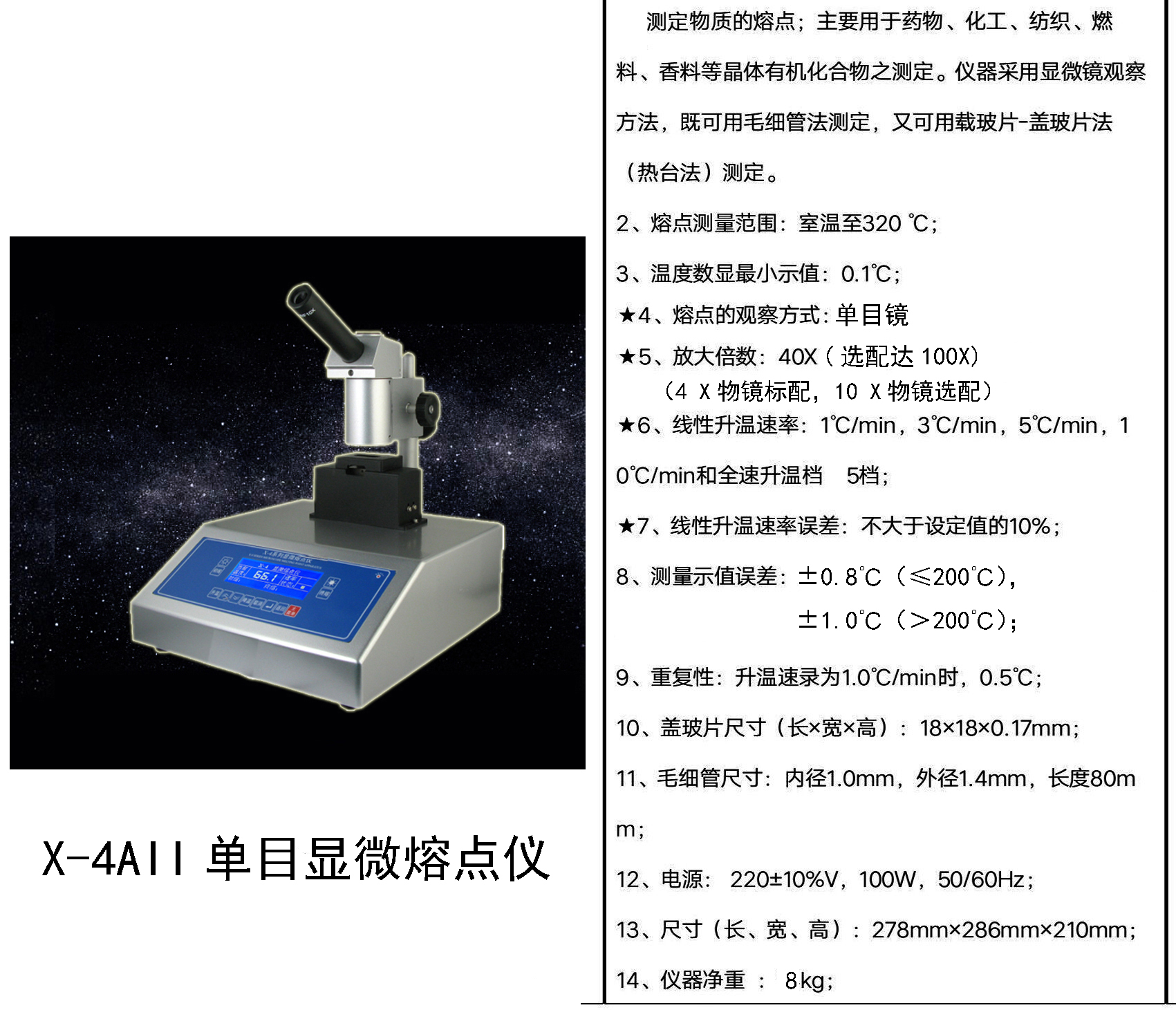 测定物质的熔点。主要用于药物、化工、纺织、燃料、香料等晶体有机化合物之测定。仪器采用显微镜观察方法,既可用毛细管法测定,又可用载玻片-盖玻片法(热台法)测定。