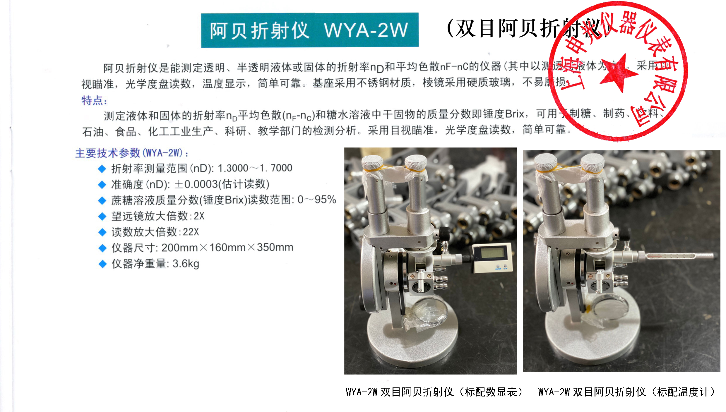 测定固体和液体的折射率nd平均色散(nf-nc)和糖水溶液中干固物的质量分数即锤度Brix。